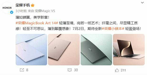 荣耀MagicBook Art 14 2025发布定档7月2日 轻薄、屏幕、AI三大卖点曝光