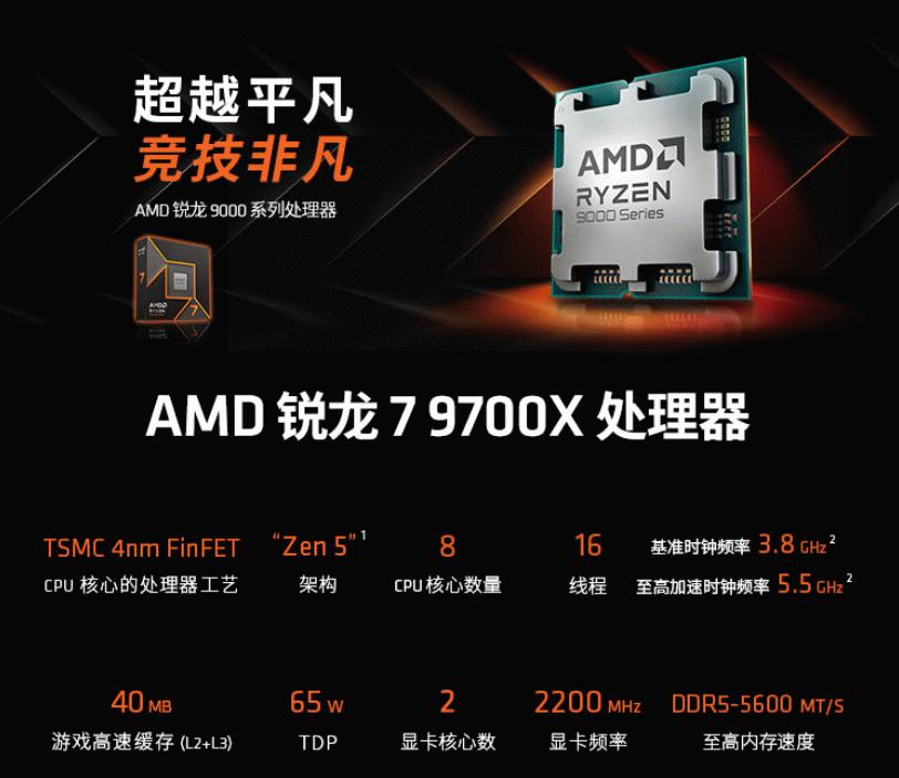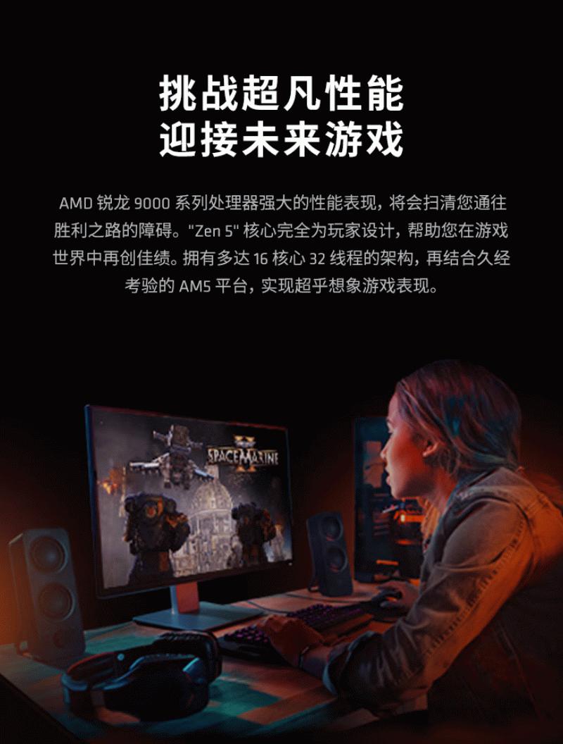 FinFET工艺制程的ZEN5架构,搭配8核心16线程的配置和高达5.5GHz的最高频率,总计40MB的游戏缓存和65W的功耗设计非常适合主流玩家使用。AMD 锐龙9000系列处理器适用于AM5插槽,支持PCIe 5.0和DDR5内存,传输带宽较上一代翻倍,完美适配新一代显卡与超高速固态硬盘。AMD最新承诺这一代至少可以用到2027年+,大家可以放心“战未来”!