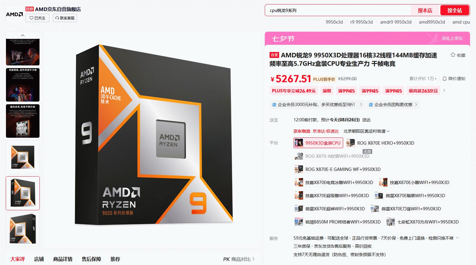 目前AMD 锐龙9 9950X3D处理器在京东自营旗舰店3C数码七夕节的报价是5299元,京东PLUS会员到手更加优惠,成为京东旗舰店会员还有0元入会抽50元E卡,首购返666京豆和晒单抽AMD周边等活动。目前AMD 锐龙9 9950X3D处理器的价格非常稳定,而且供货充足,想要在新学年打造一台“全能整机”的朋友选购这款处理器就是最佳答案。